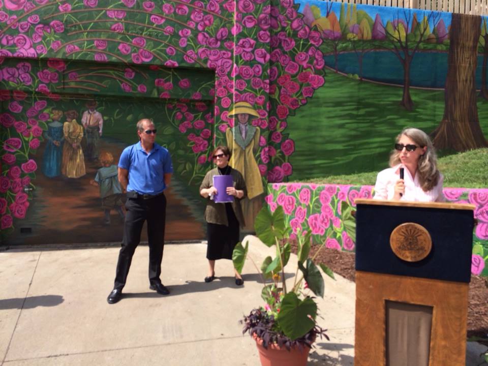 In a partnership between the City of Omaha Parks, Recreation and Public Property Department and University of Nebraska at Omaha’s SummerWorks program, high school students from across Omaha painted a mural for the Hanscom Park Greenhouse, based on a design by Pluhacek. The mural is 67’9” wide and 14’ tall, and depicts an image of Hanscom Park during its earliest days in the first years of the 1900s. The mural depiction includes citizens walking through flower gardens in the open air and through a rose-covered archway.